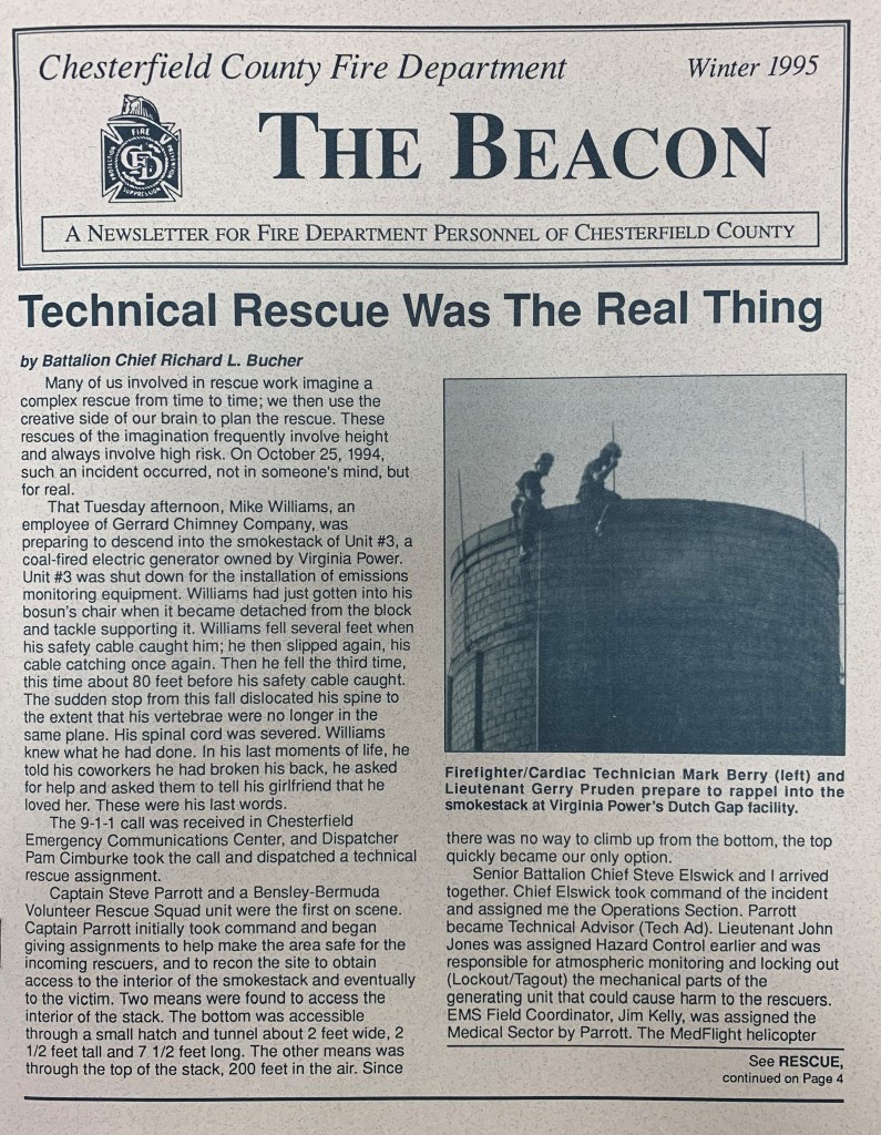 This incident happened on October 25, 1994 in Chesterfield County at the Dutch Gap Power Station and involved a confined space rescue, high angle and technical rescue, and some creativity and a plenty of nerves of steel. A worker had been on the top of a 300-foot-tall smokestack had fallen but his fall was arrested by some of his safety equipment and he was hanging about 75 feet below the top on the inside the stack.